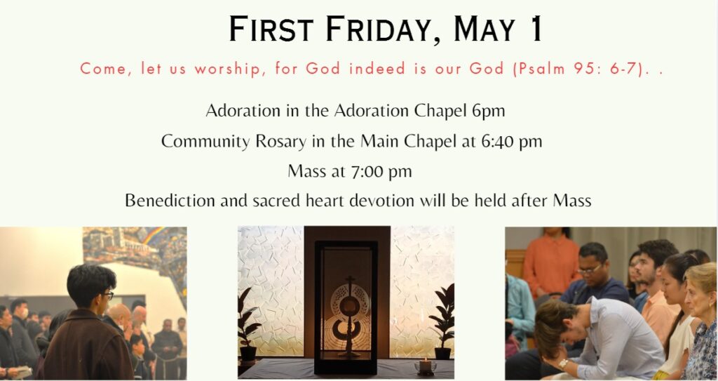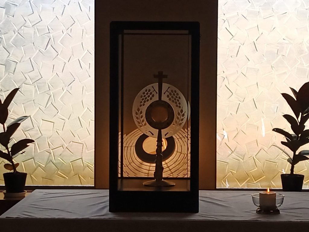 Our Adoration Chapel An Oasis Of Prayer Come and spend time with the Lord. From Monday to Friday, 9am to 6pm and on Saturdays from 9am to 3pm, the Blessed Sacrament is exposed in the small chapel for you to give thanks and to pray for the needs of others and of the world.