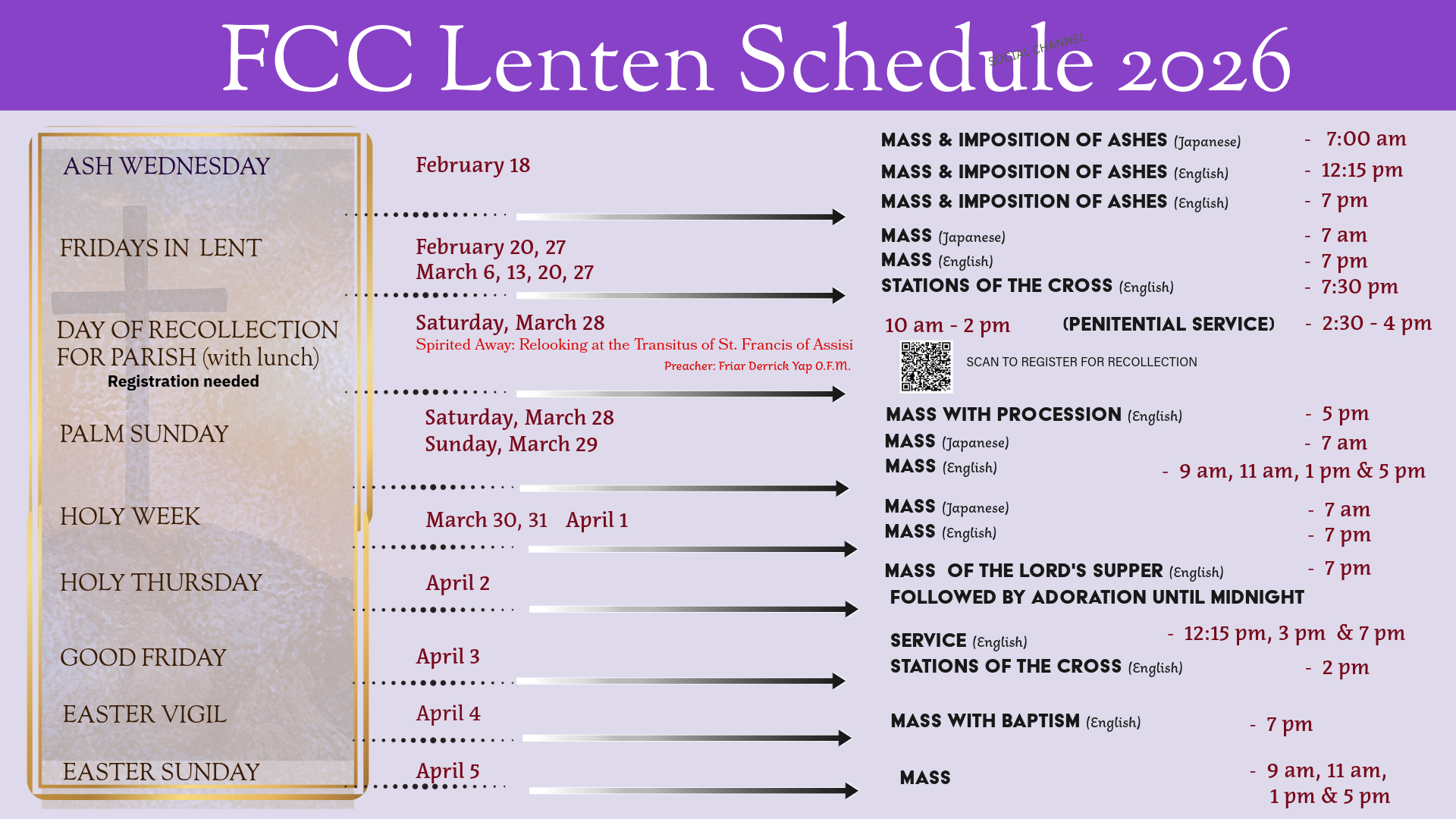 The Lenten Schedule highlights dates and times for masses and services in English and Japanese. Click the below link to see the larger version.